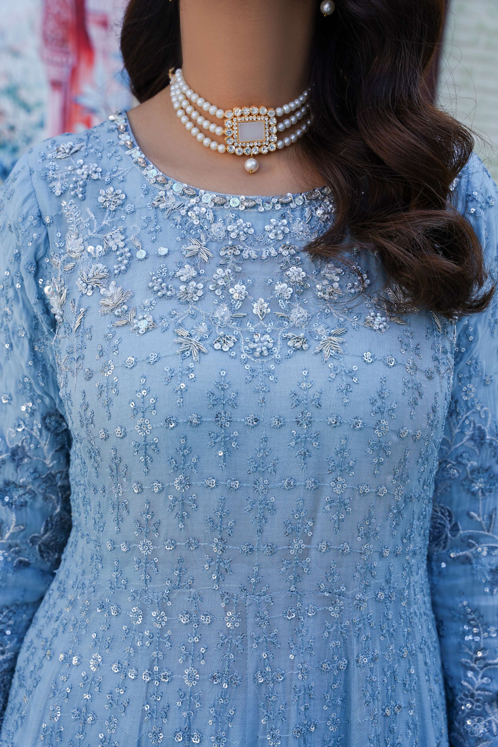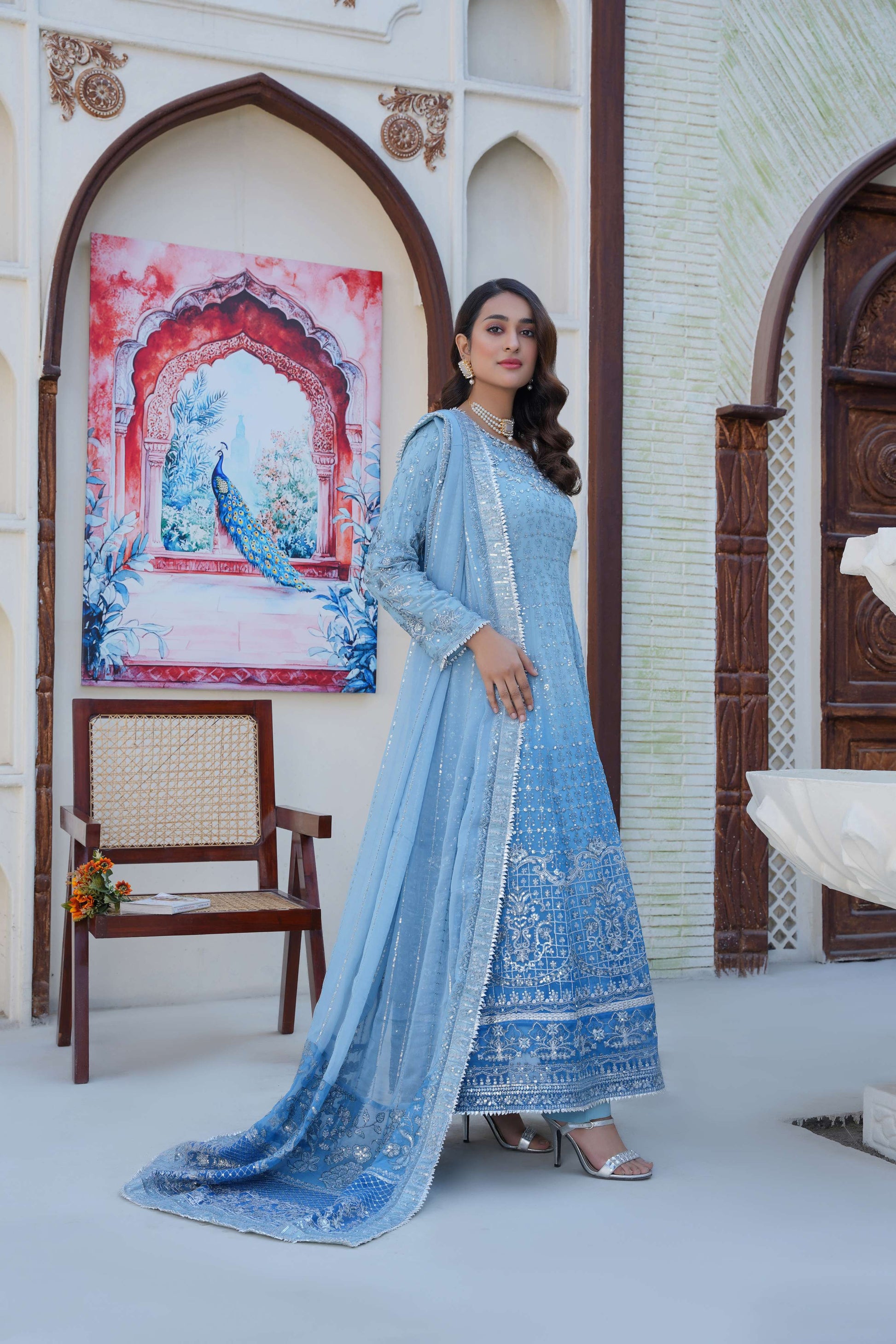 Description: Indulge in the richness of ethnic elegance with our Blue chiffon article heavily embroidered with thread zari and sequins, The design is an ethnic masterpiece with gorgeous composition. It comes with straight trouser and an embroidered chiffon dupatta