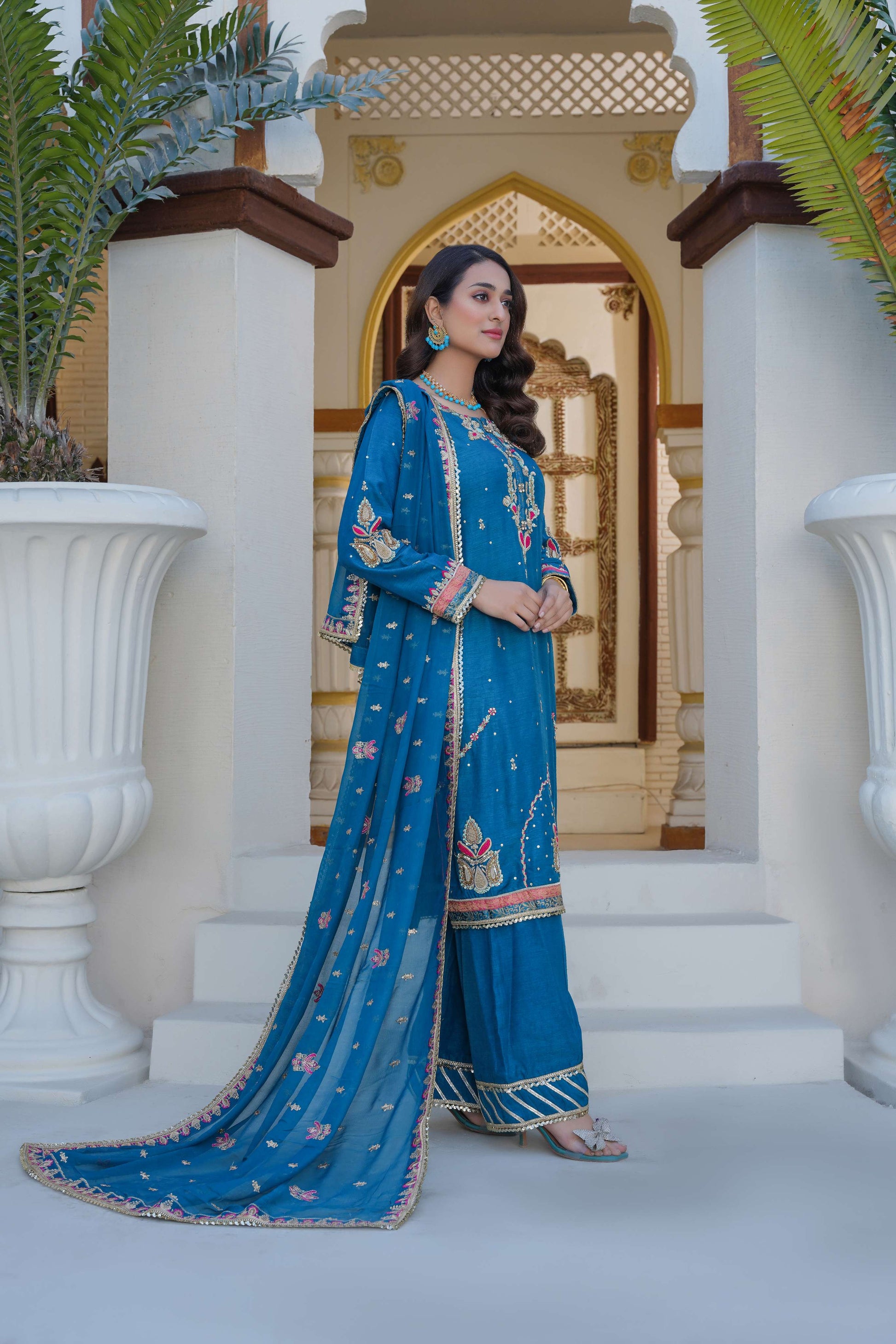 Description: Indulge in the richness of ethnic elegance with our Peacock Blue Raw Silk article heavily embroidered with heavily thread zari and sequins, The design is an ethnic masterpiece with gorgeous composition. It comes with straight trouser and an embroidered chiffon dupatta