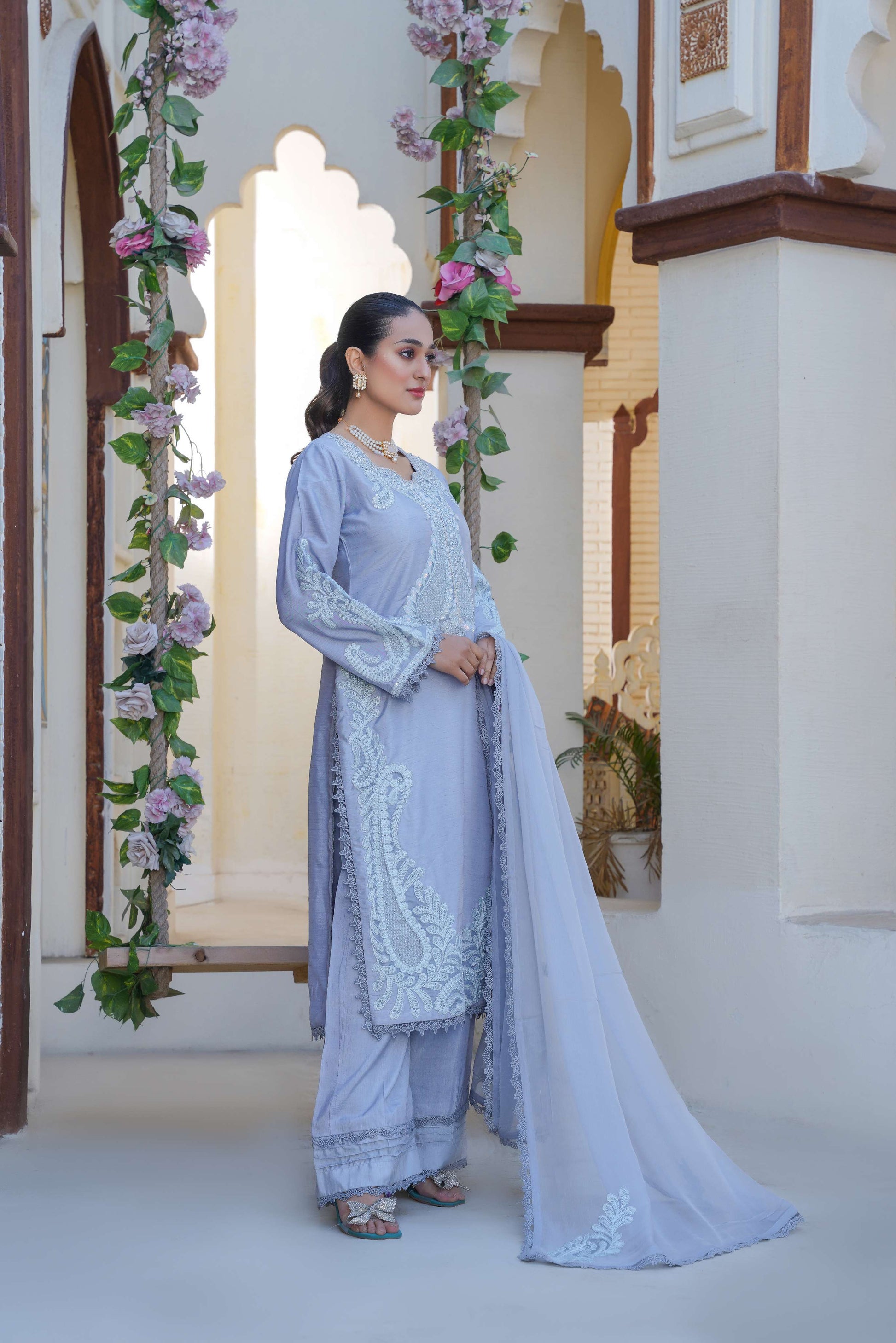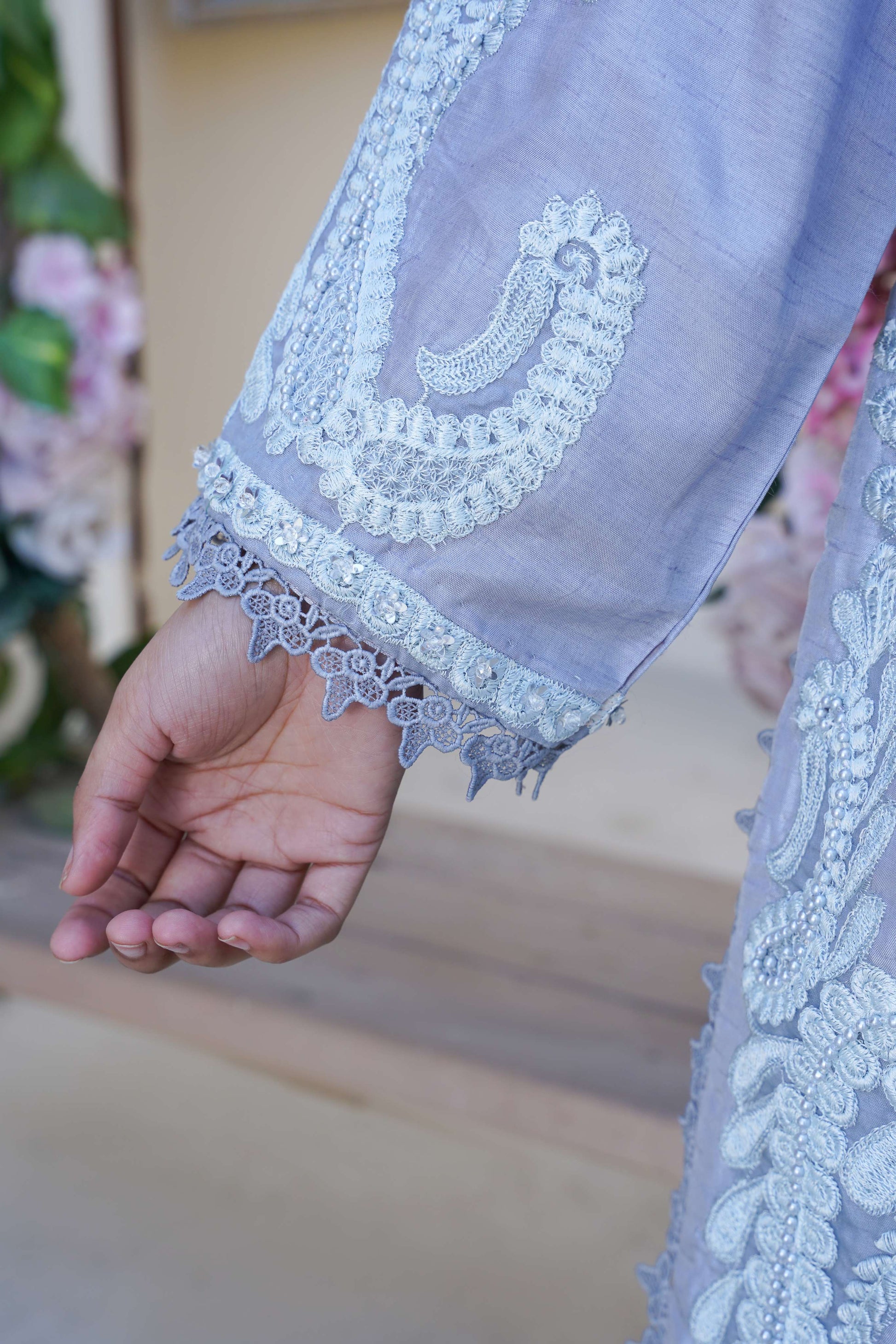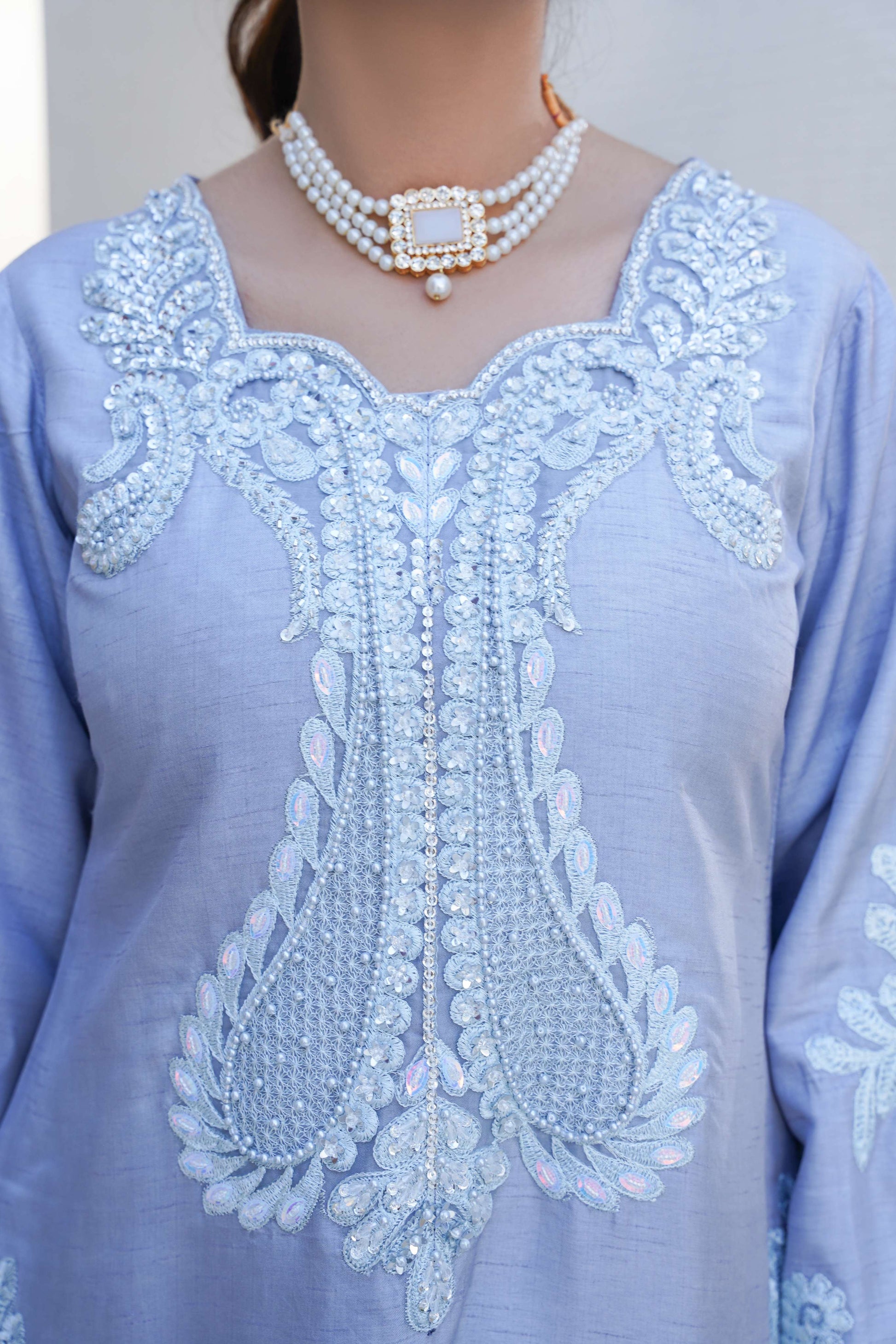 Description: Indulge in the richness of ethnic elegance with our Rock Blue Korian Raw Silk article heavily embroidered with thread zari and sequins, The design is an ethnic masterpiece with gorgeous composition. It comes with straight trouser and an embroidered chiffon dupatta