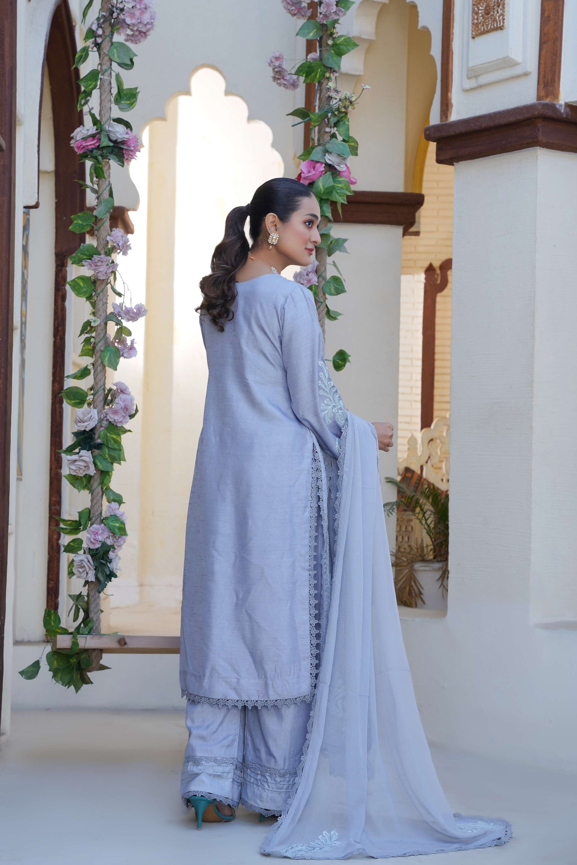 1: Shirt: Korian Raw Silk 2: Trouser: Korian Raw Silk 3: Dupatta: Chiffon