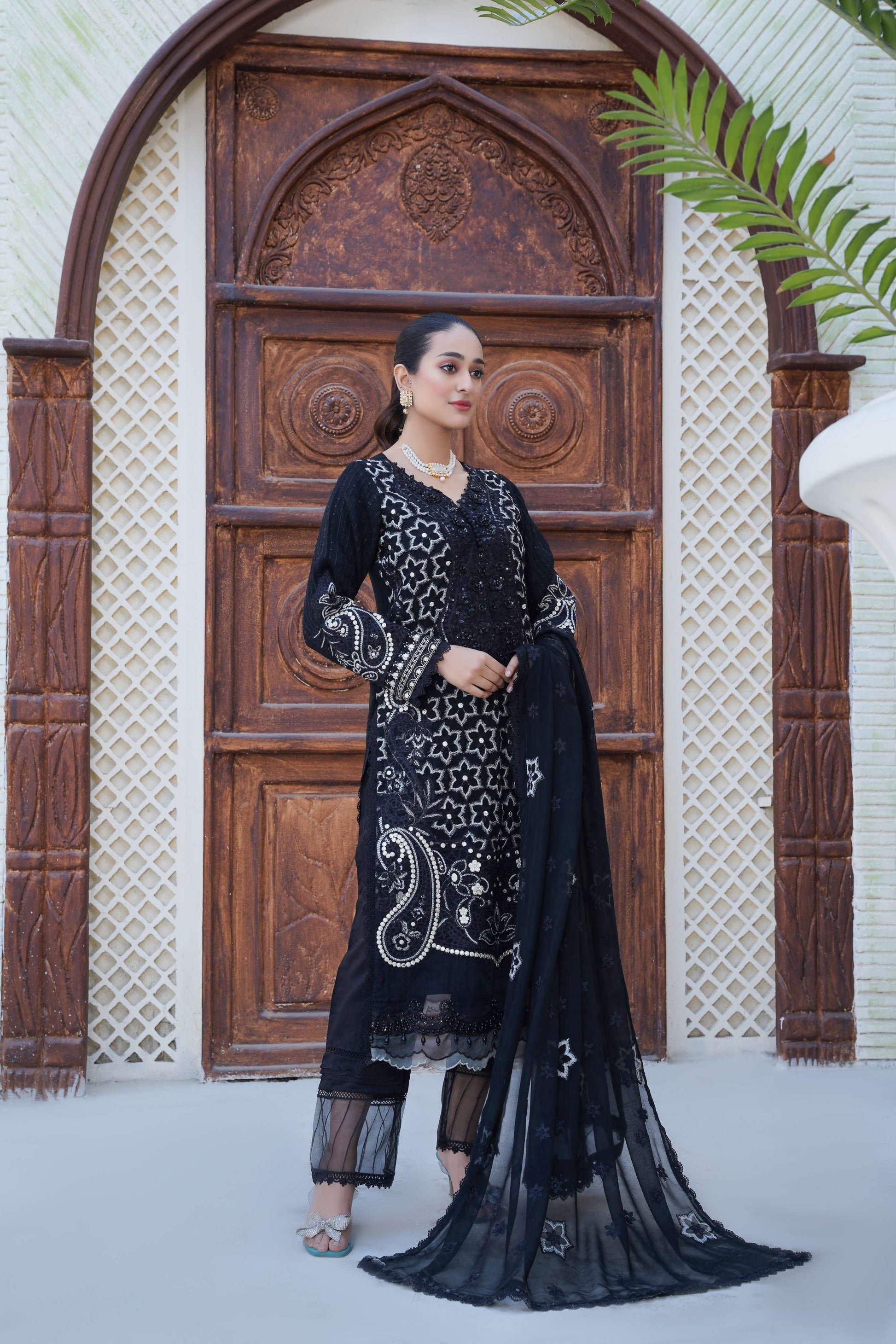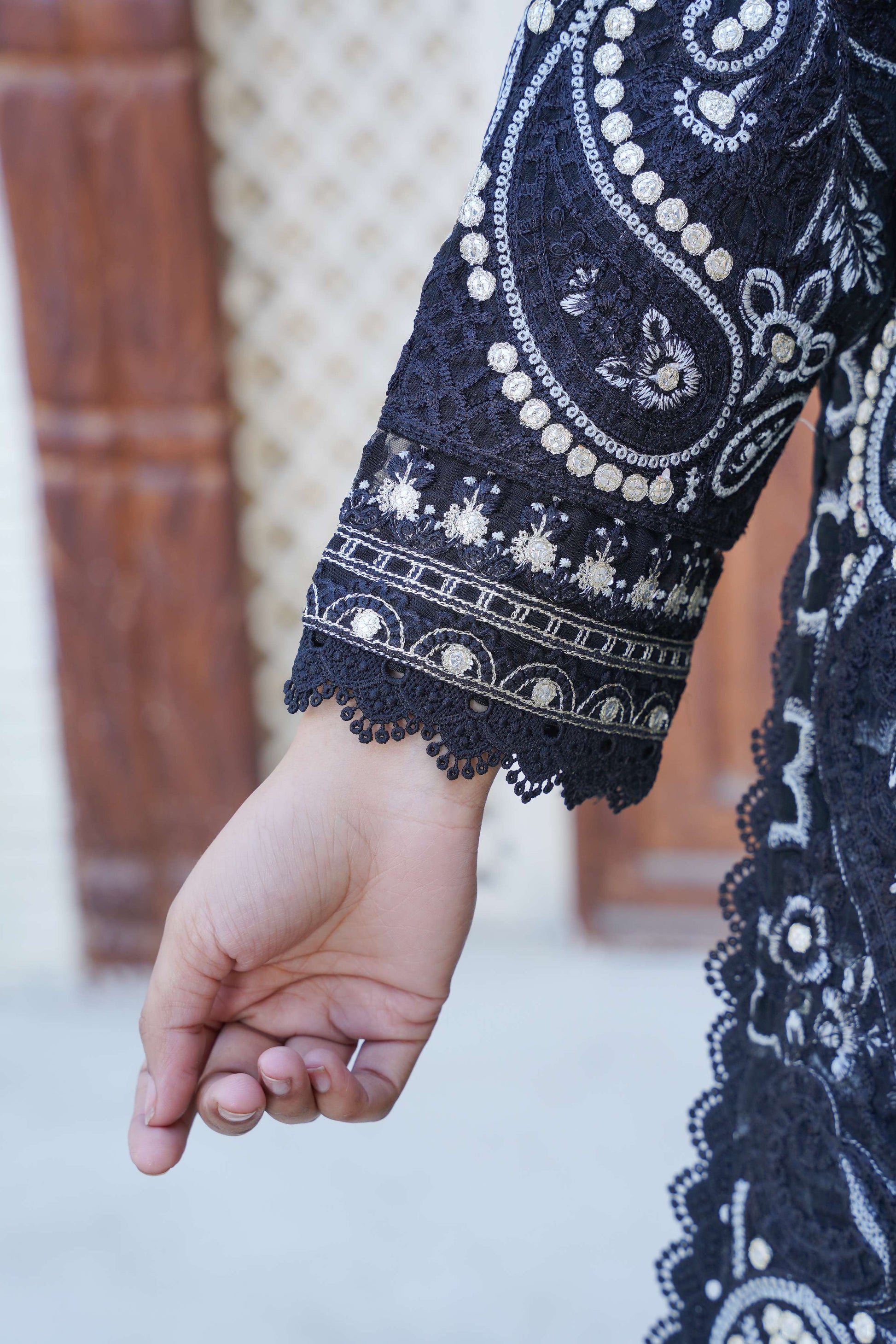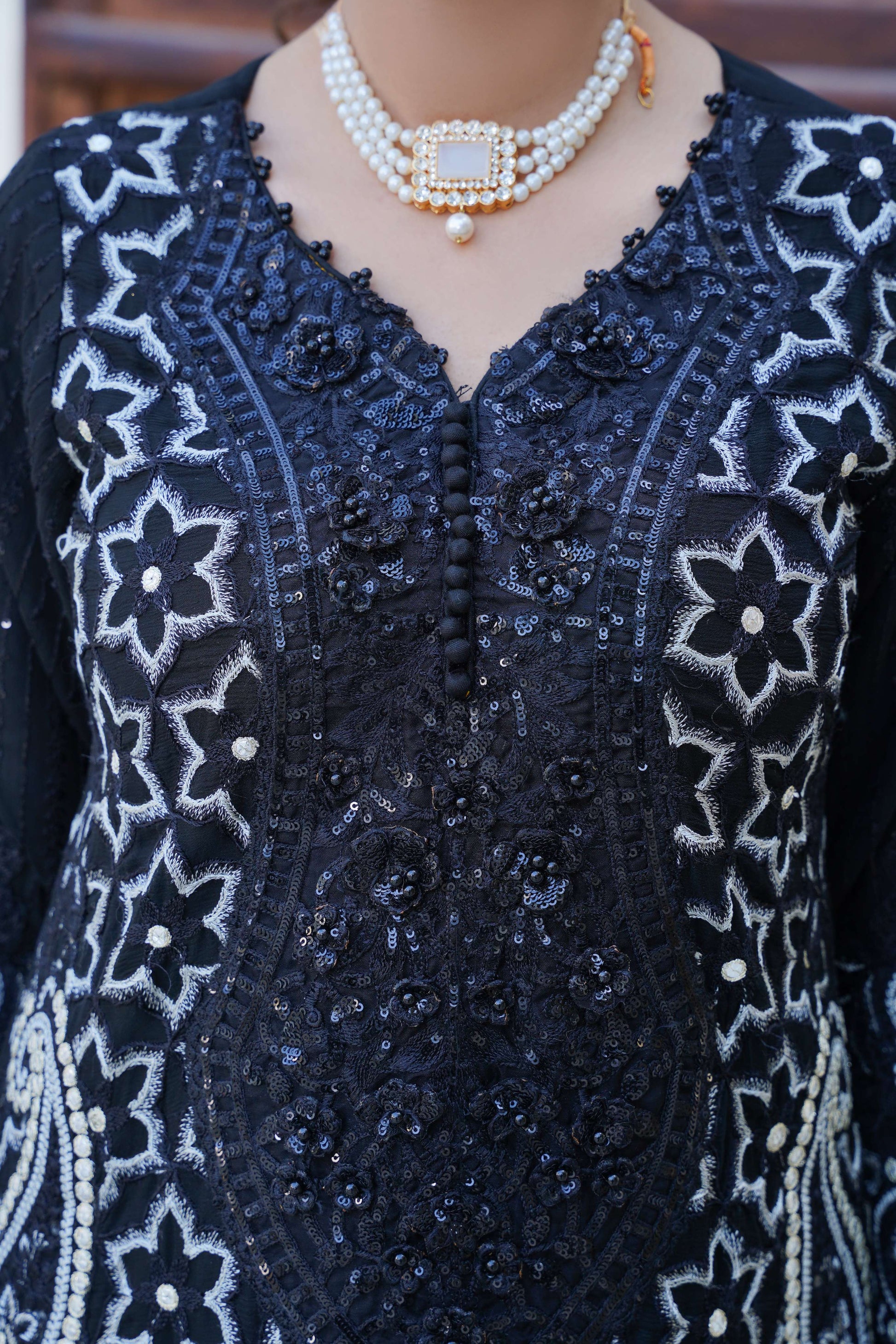 Description: Indulge in the richness of ethnic elegance with our Black chiffon article heavily embroidered with thread zari and sequins, The design is an ethnic masterpiece with gorgeous composition. It comes with straight trouser and an embroidered chiffon dupatta