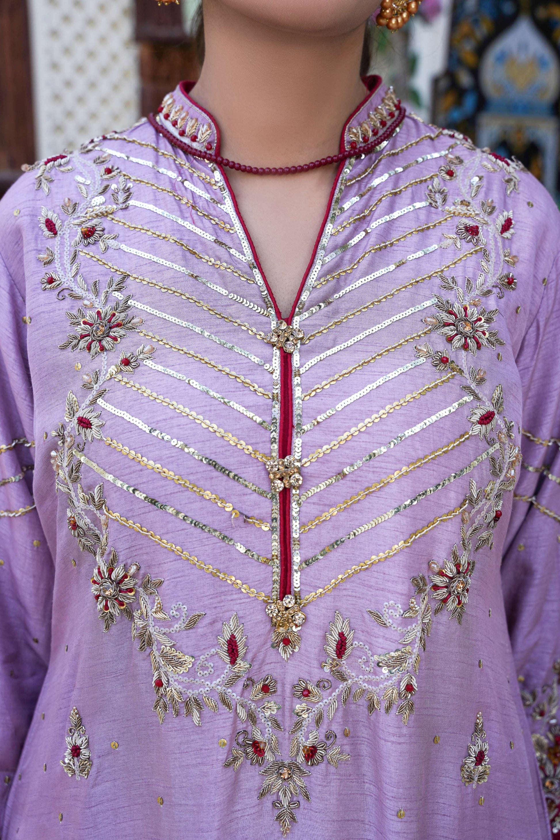 Description: Indulge in the richnes of ethnic elegance with our Pinkish Purple Raw Silk article heavily embroidered with hand embellishment thread zari and sequins, The design is an ethnic masterpiece with gorgeous composition. It comes with straight trouser and an embroidered chiffon dupatta