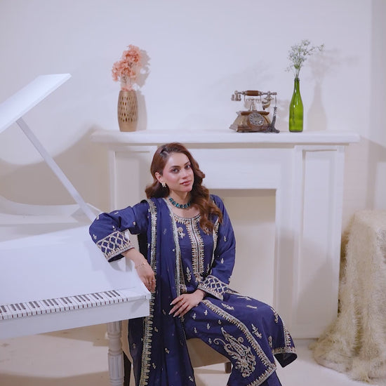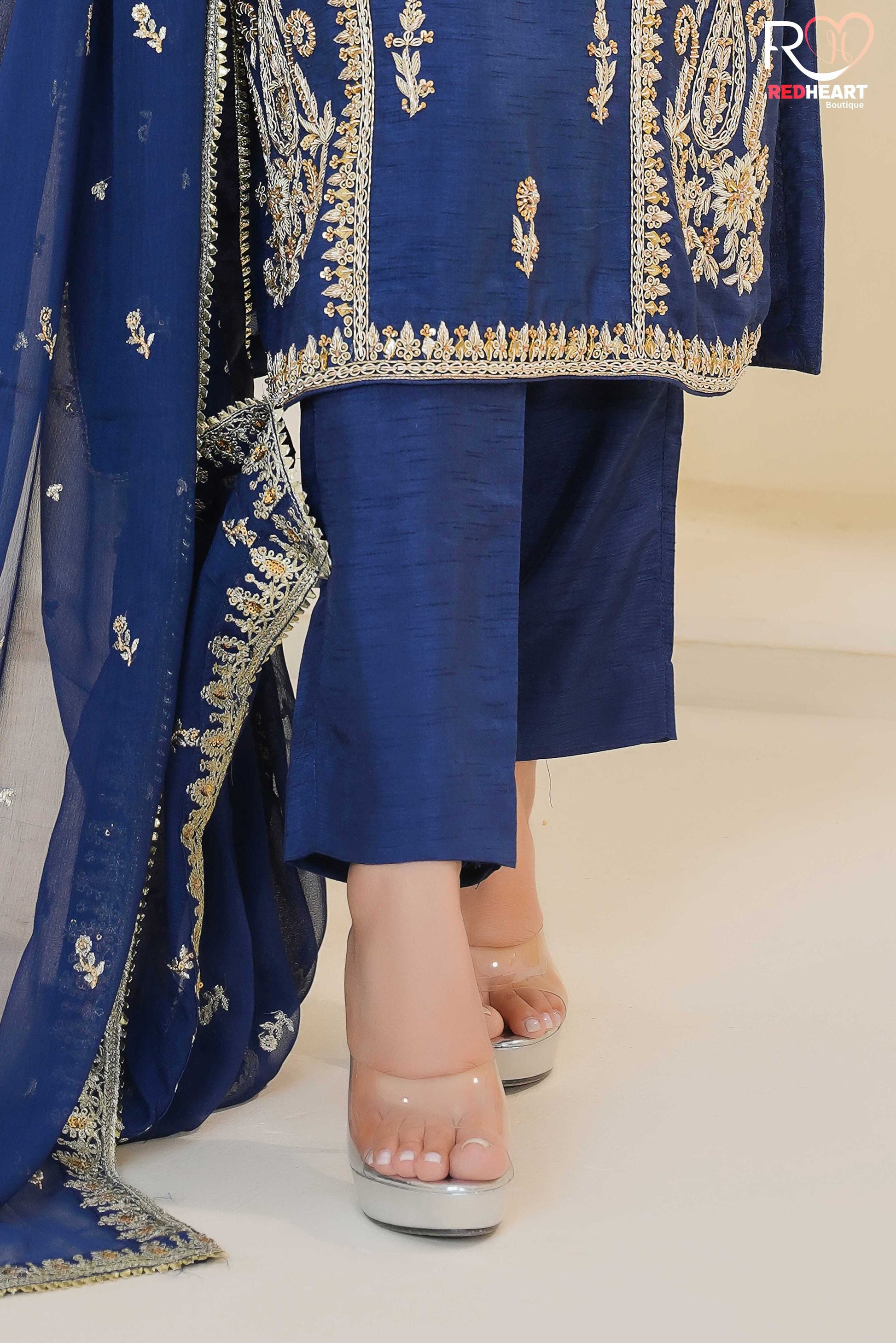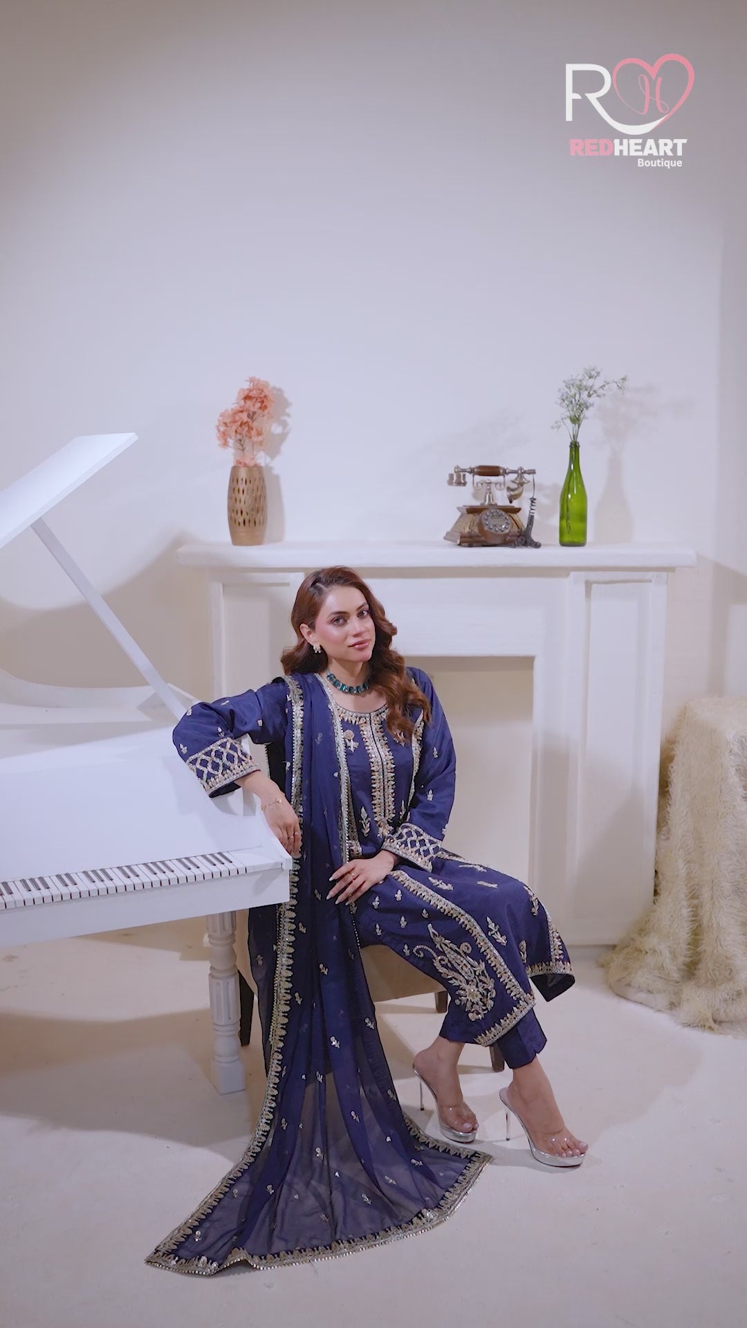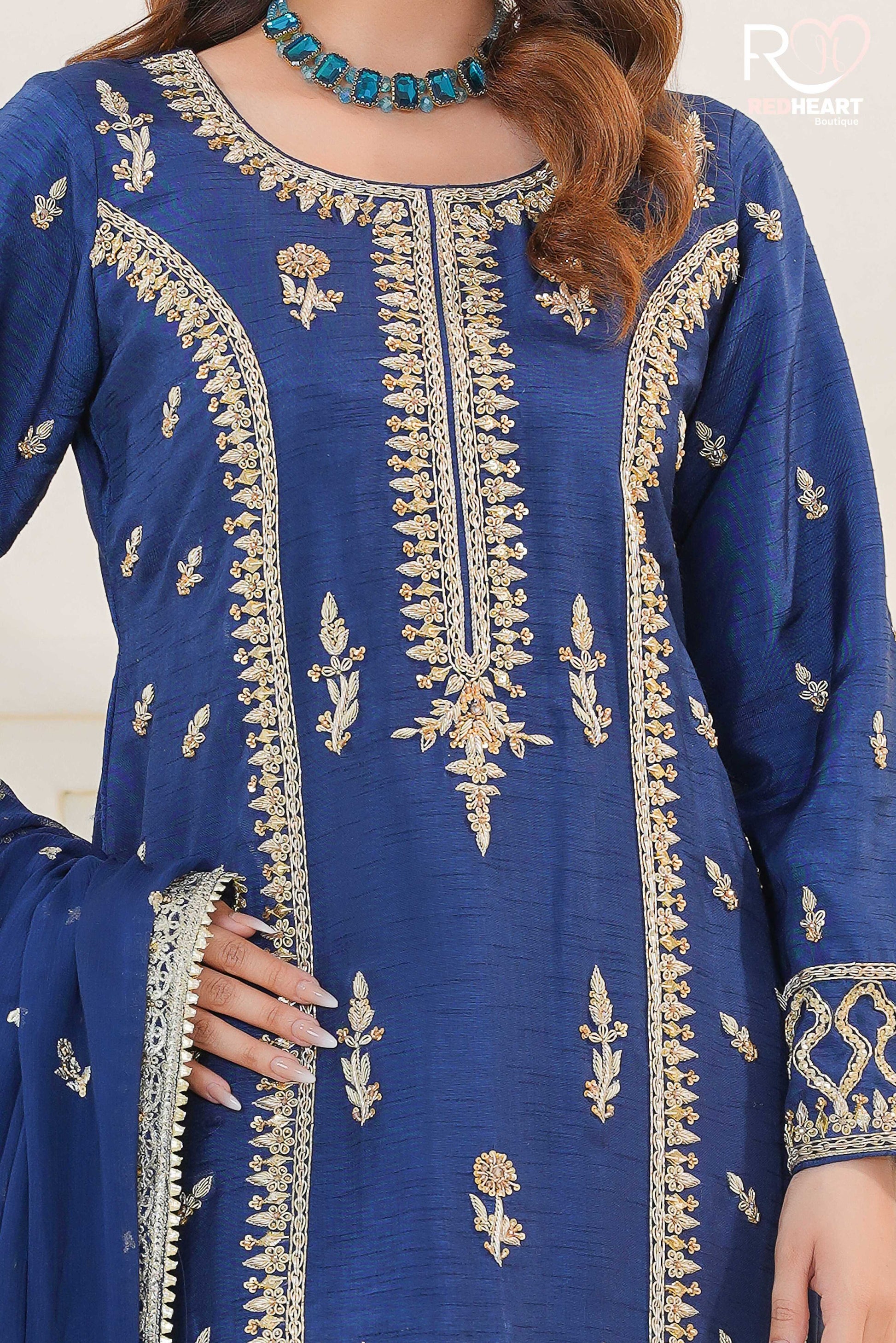 Description: Indulge in the richness of ethnic elegance with our Lapis Blue Grip Silk article heavily embroidered with thread zari and sequins, The design is an ethnic masterpiece with gorgeous composition. It comes with straight trouser and an embroidered chiffon dupatta