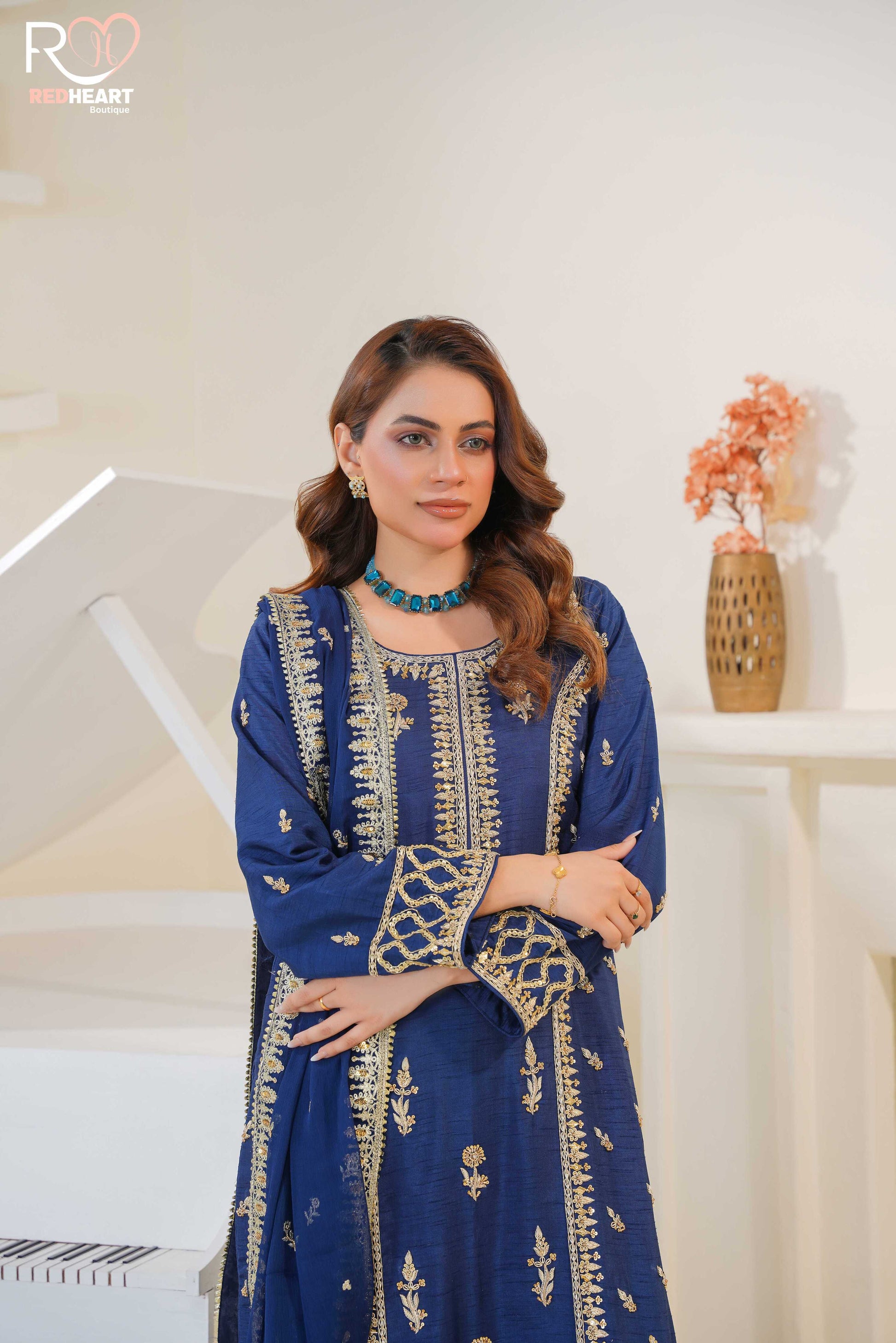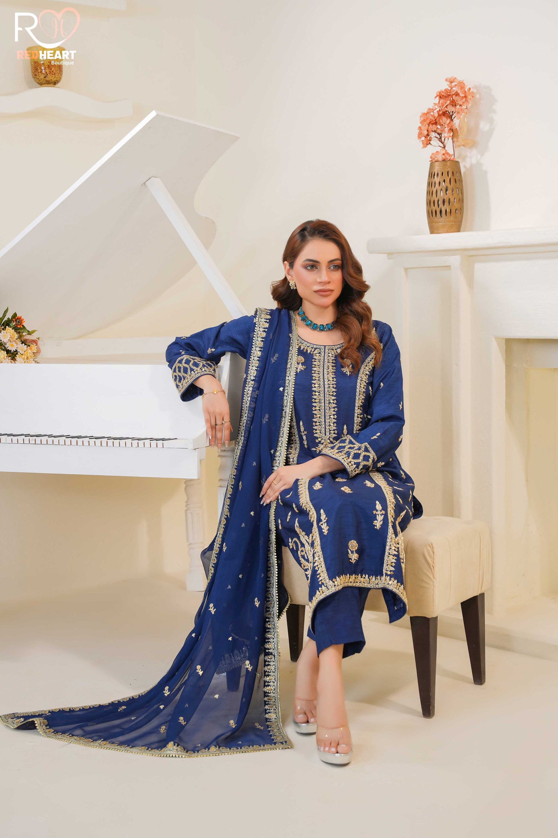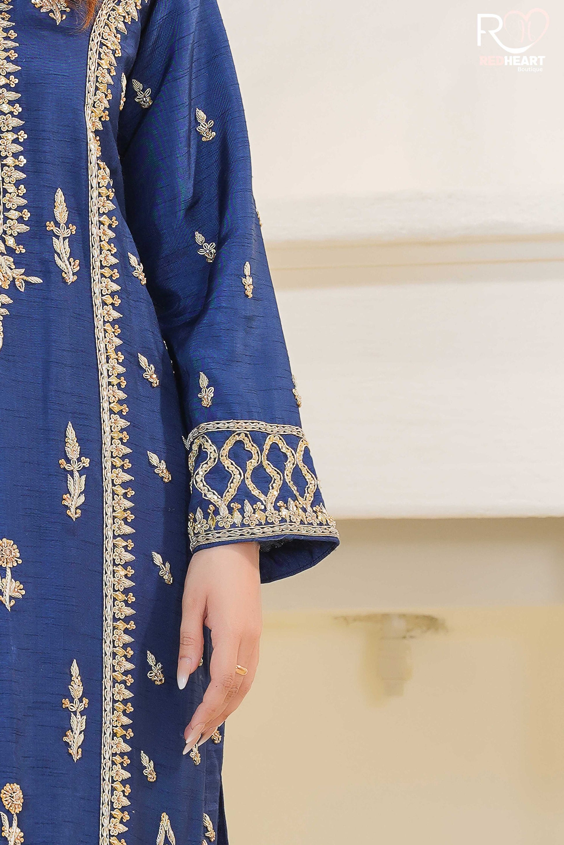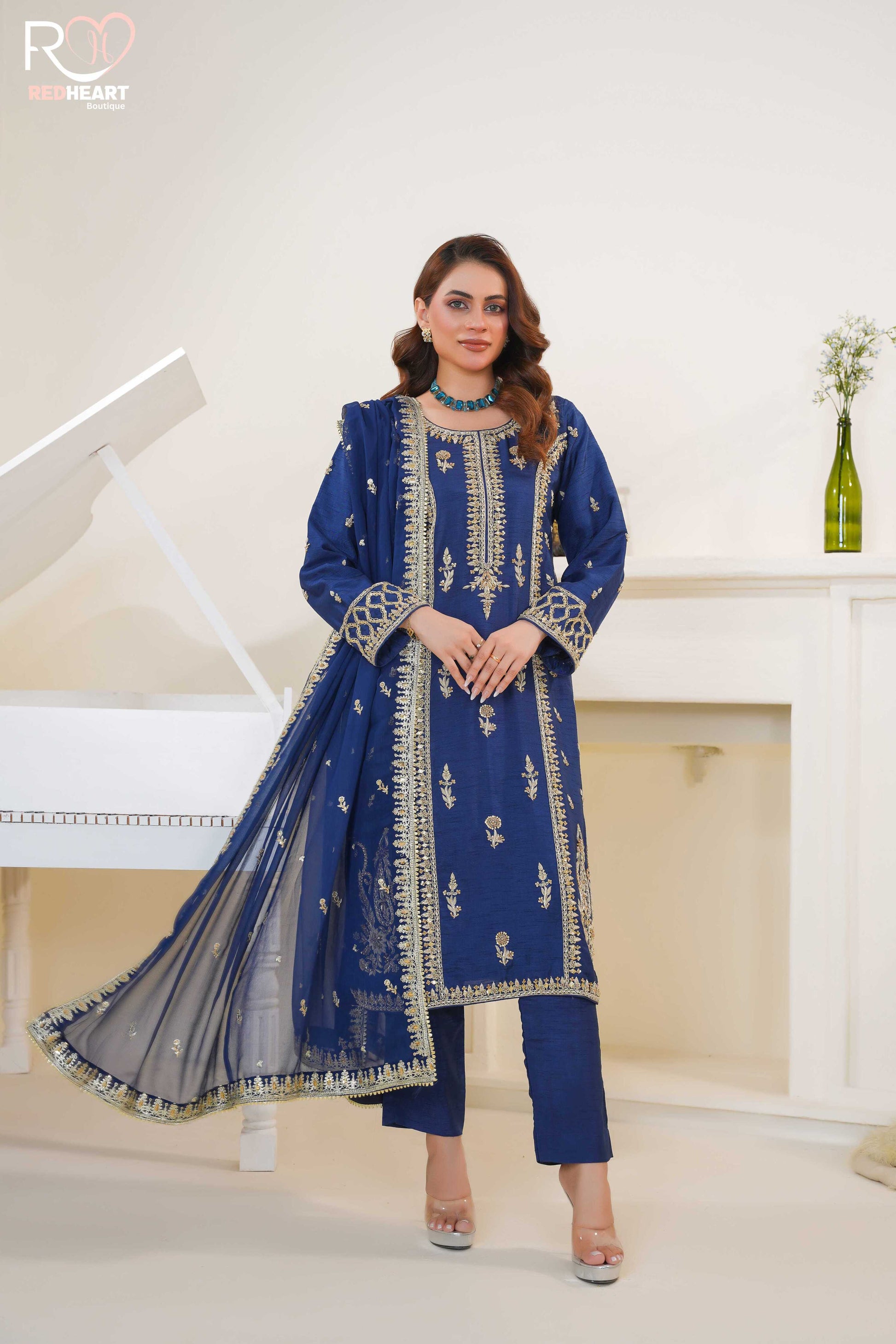 Description: Indulge in the richness of ethnic elegance with our Lapis Blue Grip Silk article heavily embroidered with thread zari and sequins, The design is an ethnic masterpiece with gorgeous composition. It comes with straight trouser and an embroidered chiffon dupatta