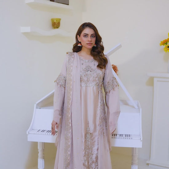 This festive season style is like a princess in this beautiful ensemble, rendered in a pink swan shade and crafted in a classy Pishwas silhouette,heavily embroidered with thread zari and sequins.Exquisitely embroidered with an intricate design in mesmerizing hues and enhanced with scintillating embellishments in dazzling accents, it comes with straight trouser and beautifully embroidered contrast chiffon dupatta.