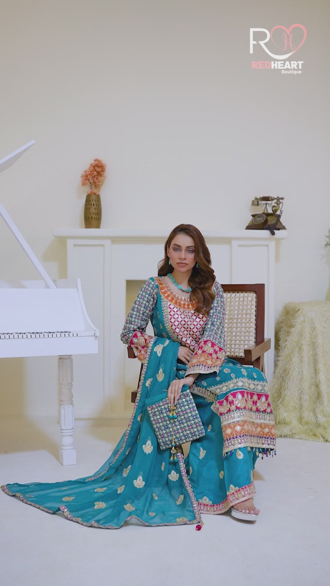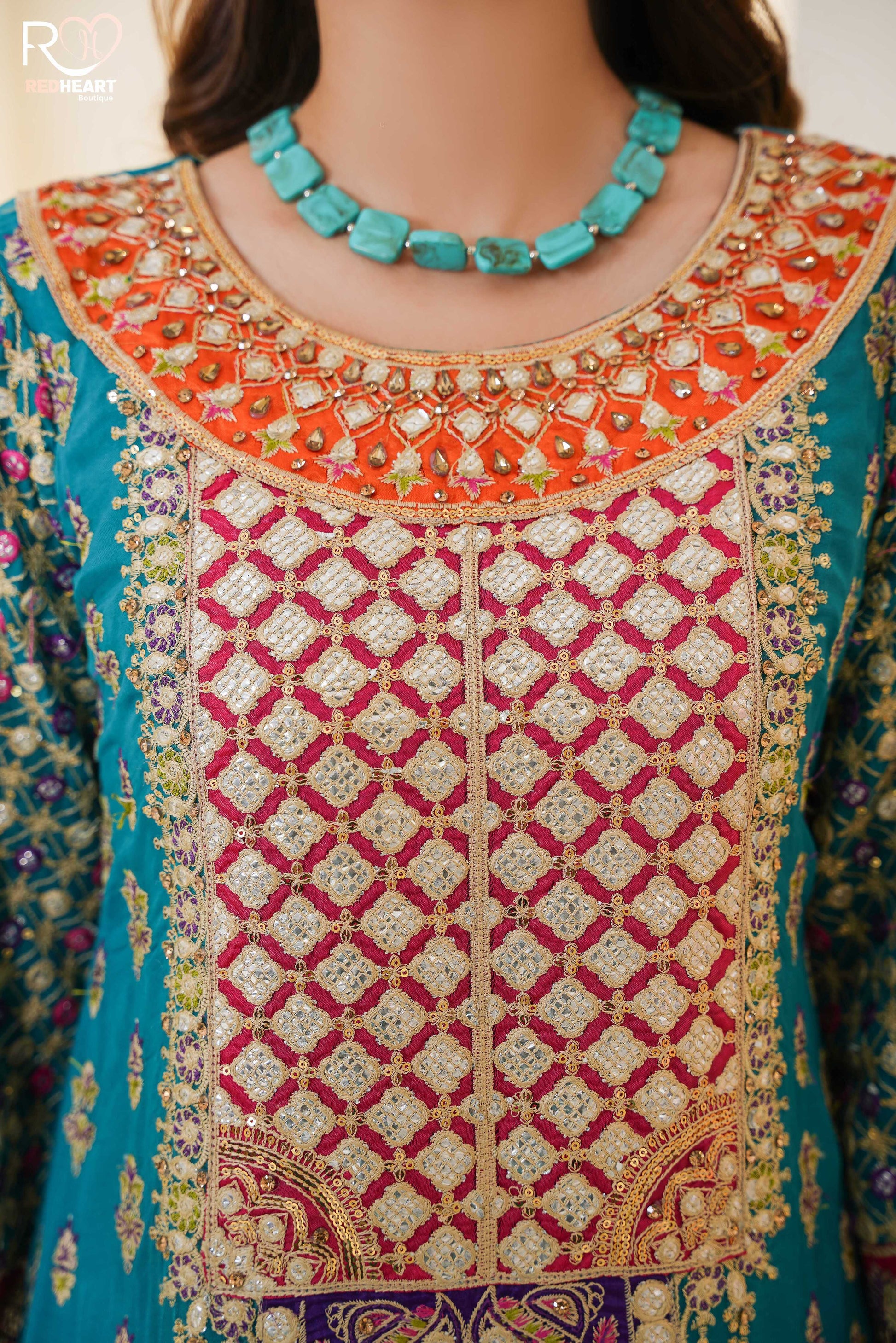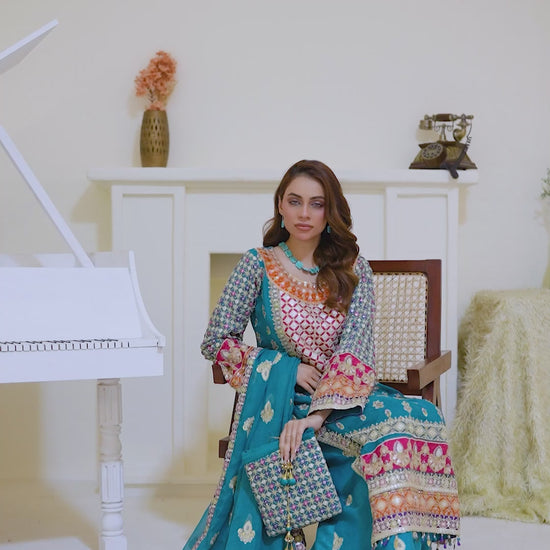 Description: Indulge in the richness of ethnic elegance with our Eastern Blue chiffon article heavily embroidered with thread zari and sequins, The design is an ethnic masterpiece with gorgeous composition. It comes with beautifully designed sharara and an embroidered chiffon dupatta.